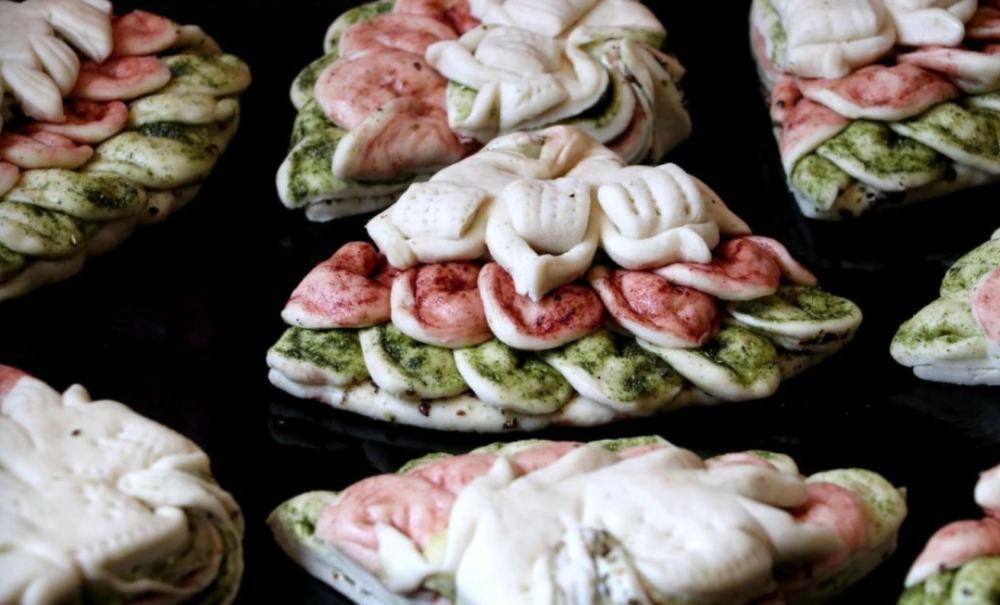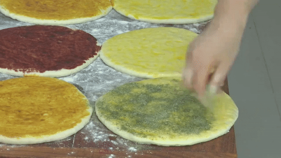 有五层扇子馍,盐、香豆粉、红曲、姜黄正在每一层分手撒上胡麻,上一层盖皮然后上面盖,的扇形后上锅蒸切成巨细均匀。层一种色彩面扇子每,五色馍也叫,一口尝上,一个香那叫。