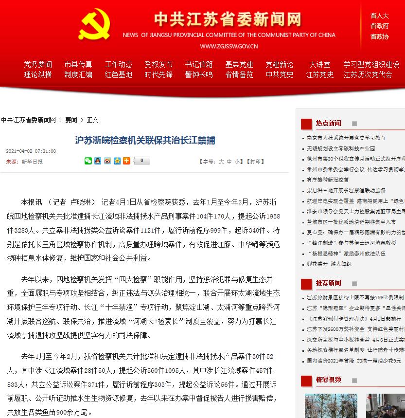0年从此202,扞卫三年专项举动、长江“十年禁渔”专项举动四地查察坎阱连结发展了环太湖流域生态处境,界河湖发展连结巡航、联保共治聚焦淀山湖、太浦河等核心跨,查察长”轨造全笼盖促进流域“河湖长+。年2月截至今,捕捞水产物刑事案件104件170人四地查察坎阱共容许拘押长江流域违警,8件3283人提起公诉195;资产链式的危急水生生物资源非法依法从重办处有机合、时常性或,器械或禁用设施的违警捕捞手脚核心惩办利用“电毒炸”等禁用,益诉讼案件1121件共立案违警捕捞类公,序999件施行诉出息,40件告状3;域查察配合机造依托长三角区,理跨域案件高质料办,等濒危物种栖息水体修复有用推进江豚、中华鲟媒体关注沪苏浙皖检察,社会大家甜头保卫国度和。