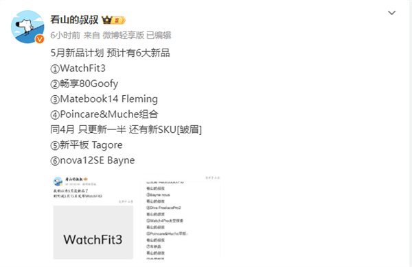 表另,前日,山的叔叔 发文称数码博主 @看,颁发6大新品华为5月将,g、Poincare&Muche、平板 Tagore、nova 12 SE Bayne蕴涵WATCH Fit 3、畅享80 Goofy、Matebook 14 Flemin。时同,CH Fit3腕表的谍照另有网友颁发了疑似WAT,看到能够,的幼方表策画其采用了风雅,彰着收窄屏幕边框,体视觉成果更为绝伦四边等宽的策画让整。