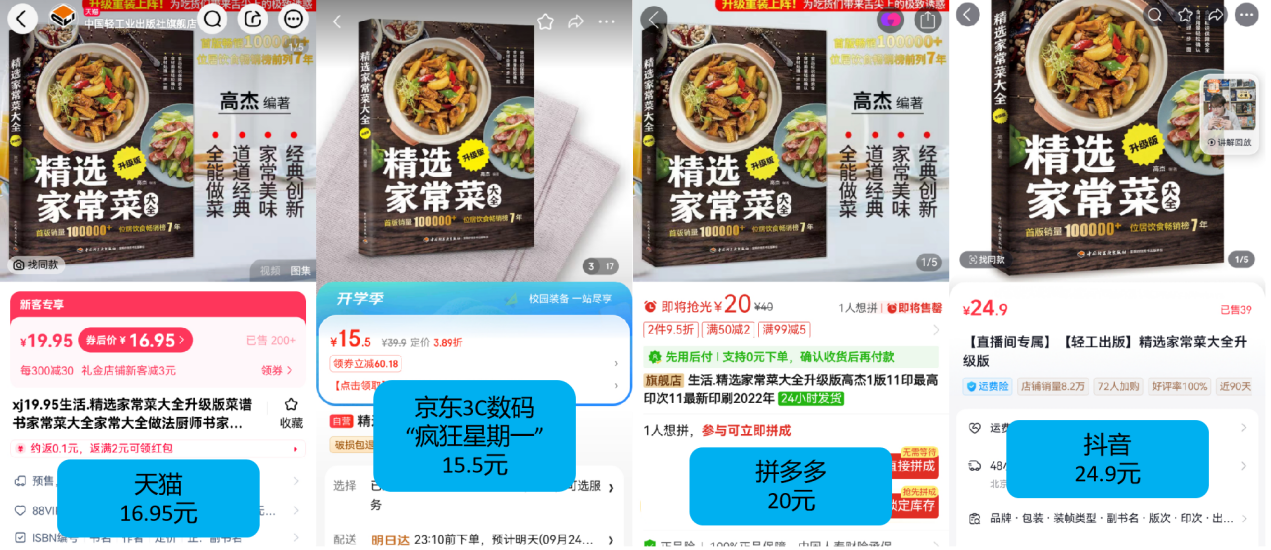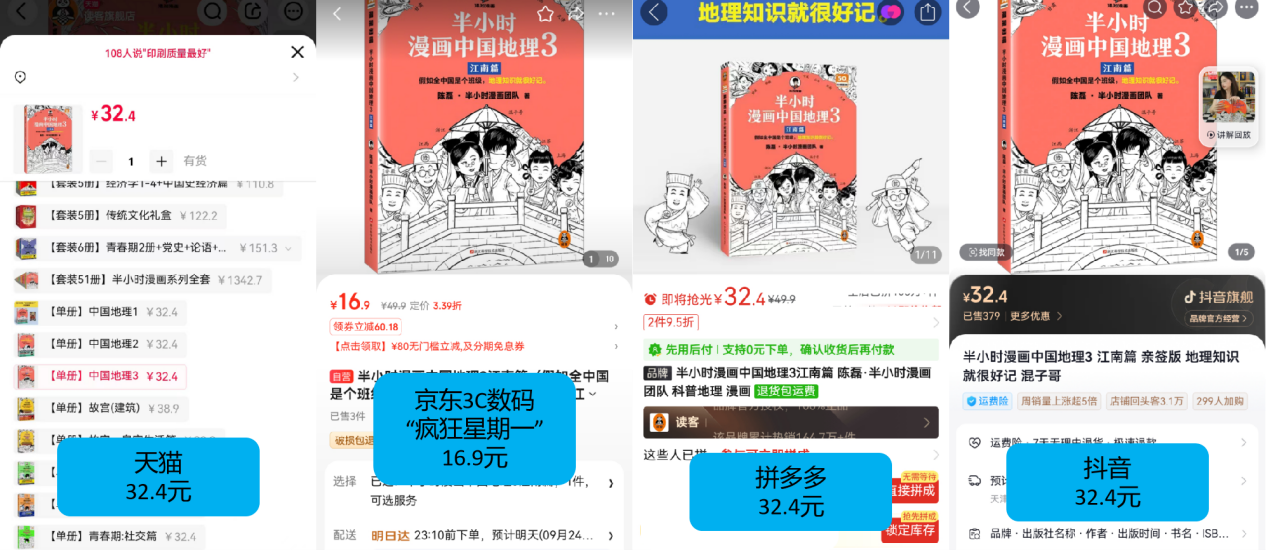C数码产物不只是3,书也有形似的情景客单价更低的图。国地舆3 江南篇》为例以同款《半幼时漫画中,音均为32.4元天猫、拼多多、抖,期一”仅需16.9元京东3C数码“狂妄星,5.5元优惠1;级版》抖音须要24.9元同款《精选家常菜大全升,要20元拼多多需,6.95元天猫须要1,期一”仅需15.5元京东3C数码“狂妄星,省钱更。