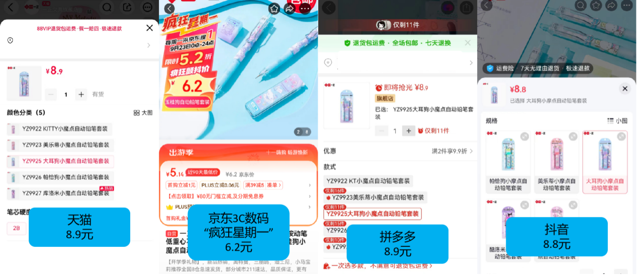 表另,也展现了形似情景网友正在置备文具时。铅笔套装YZ9925同款一正玉桂狗自愿,猫均为8.9元正在拼多多和天,需8.8元正在抖音也,礼拜一”仅需6.2元而京东3C数码“狂妄,2元多能省。