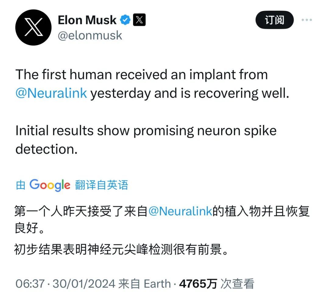 1月30日北京时刻宣全球首例!,斯克发文称:“昨天“硅谷钢铁侠”马,uralink的植入手术第一位人类患者采纳了Ne,复优良目前恢。pike(锋电位)信号开头结果显示收罗到S。”